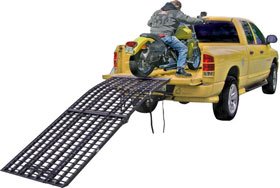 Slip resistant rung design forestalls wheel slippage.Arched frame allows for introduced clearance.Ramps will also be connected for delivered support when loading heavier bikes.Solid plate style attaching lip is method more desirable then the finger fashion.Folds to 1 of 2 its length for simple storage and transport. A new four beam make greater device engineered for loading bikes and ATVs with a maximum combined capability of 1500 lbs when the utilization of the intestines and side sections collectively. Each of the 3 pieces function evenly spaced, slip-resistant rungs, fold in 1 of 2 for storage, have a superior plate attaching lip, and bolt together for introduced stability. Five safety straps are included to stop ramp kick-outs and to restrict facet-to-side movement during loading / unloading.. ... Read more Black Widow 3 Piece Folding Arched Motorcycle/ATV Ramp